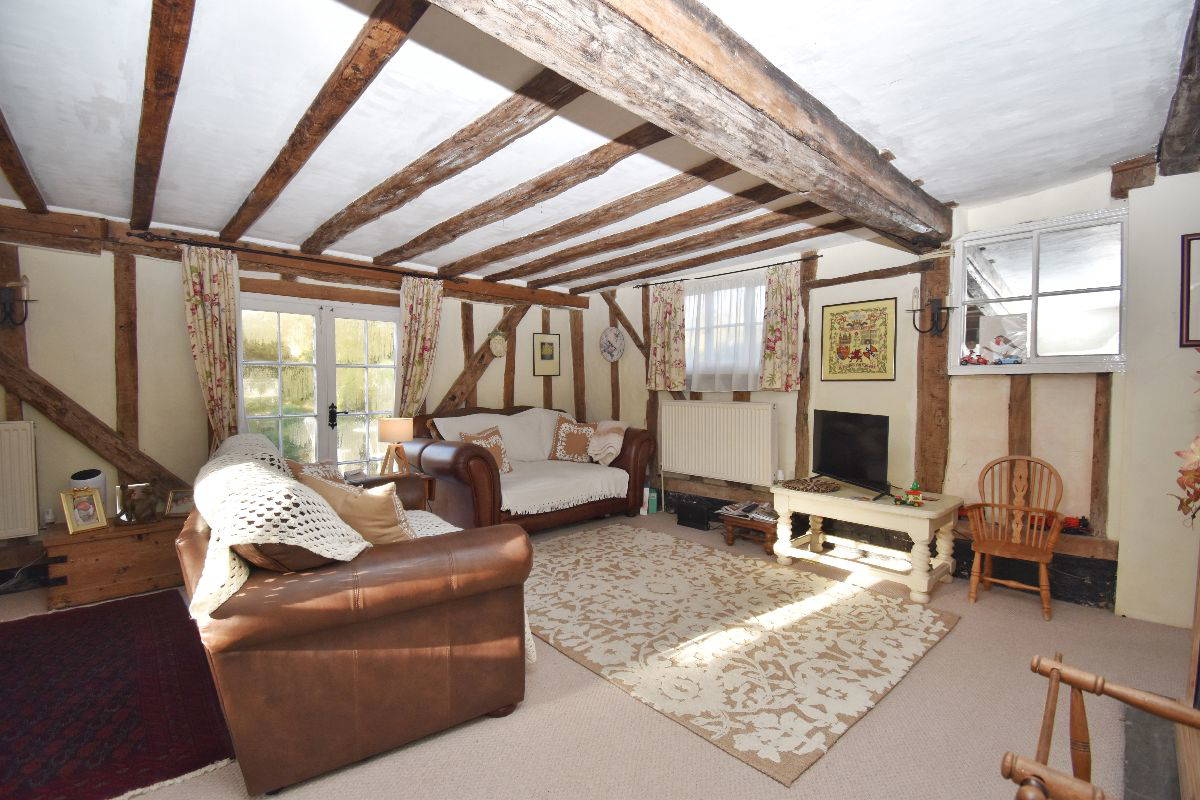 Living Room (5.50m x 4.50m): An inviting and great sized living room. Exposed beams throughout and stone flooring. Built-in cupboard for storage. Window to front and window to side aspect, door to bathroom, French doors to rear garden, radiator.
