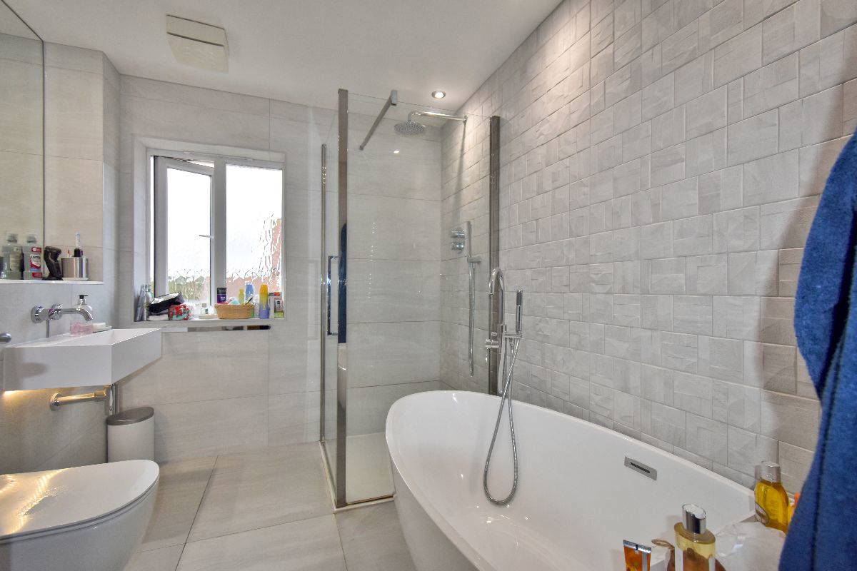 Family Bathroom: A beautifully appointed bathroom featuring a freestanding decorative bathtub, separate shower cubicle, WC, and wash basin with vanity unit. Obscure glass window to the rear aspect.