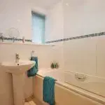 Family Bathroom: with window to front aspect, matching suite comprising low level WC, wash basin, bath with shower over, tiled floor and wall tiles.