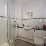 Ensuite Shower Room: Modern white suite comprising, WC, a basin set in a vanity unit and corner shower with window to side aspect.