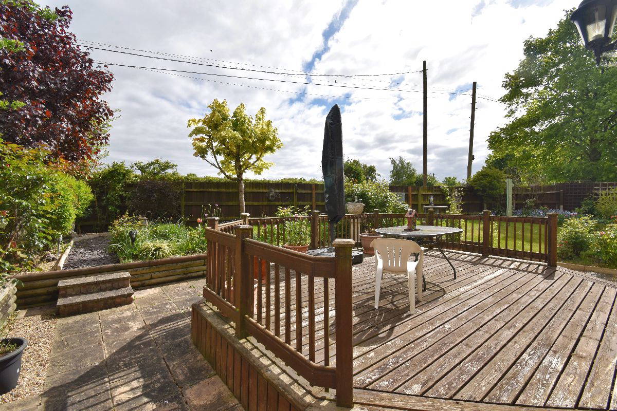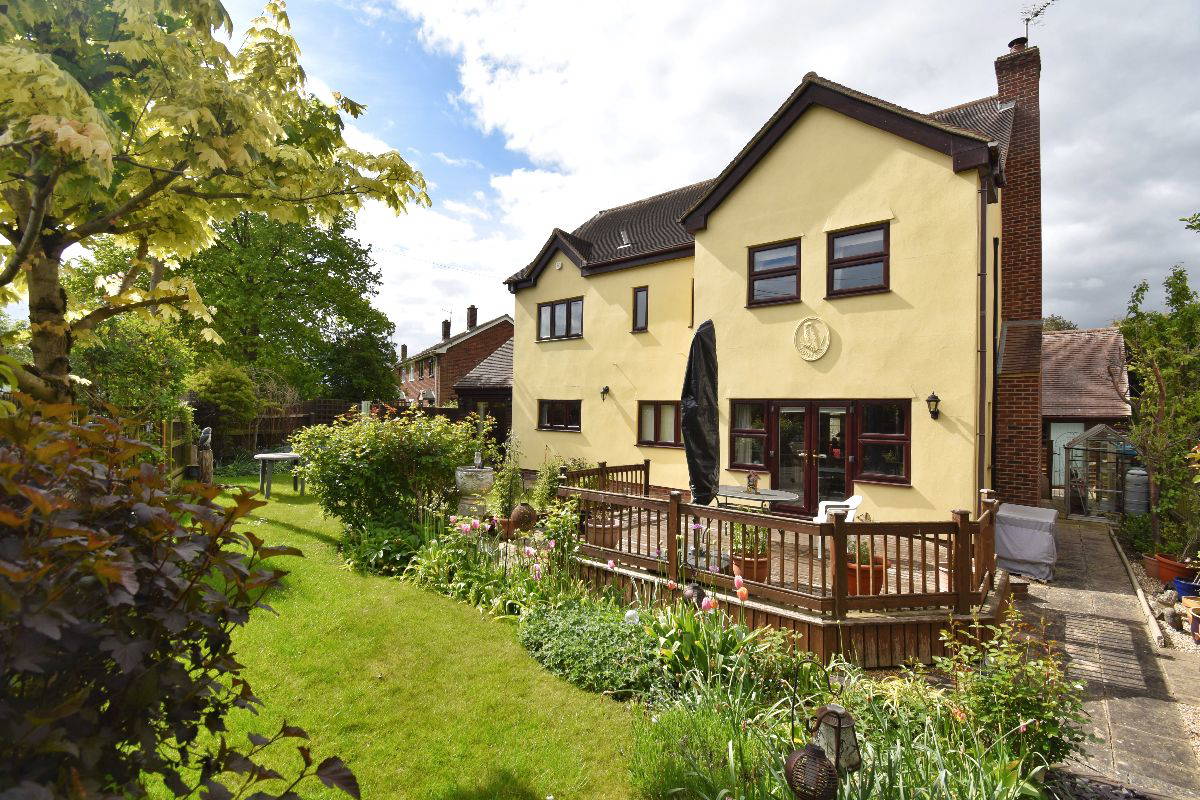 To the front of the property is a large gravelled driveway leading up to the double garage. Access to the rear of the property through a side gate, with green house. The south facing rear garden is beautifully kept with a good range of mature shrubs, climbers, roses and 2 decked areas. The rest is laid to lawn.