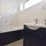 Bathroom: New fitted bathroom with bathtub, shower over, WC and wash basin with vanity unit along with towel rail. Window to side access.