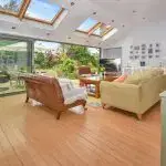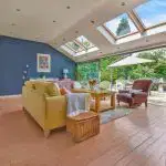 FAMILY ROOM: 21' 8" x 15' 5" (6.6m x 4.7m) Fantastic additional living space with full width double glazed sliding doors onto the terraced area and rear garden. Bamboo flooring, Velux roof lights, range of energy efficient spotlights, part vaulted ceiling, radiators with decorative covers, electric underfloor heating, multi-paned glazed doors to: