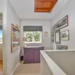 FAMILY BATHROOM: Bamboo flooring, bathtub with mixer tap, shower enclosure with tiled splashbacks and wall mounted shower and controls, sink with mixer tap, low level WC, heated towel rail and door to large airing cupboard with shelves, housing the boiler and hot water tank.