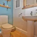 CLOAKROOM: WC, pedestal wash hand basin with mixer tap, tiled splashbacks, chrome heated towel rail, bamboo flooring.