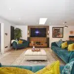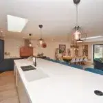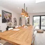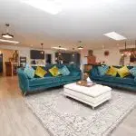 This stunning space is finished to a very high standard, featuring a contemporary kitchen with integrated appliances, a large stone-topped island, and generous areas for both dining and relaxing. An internal door leads through to a spacious pantry fitted with additional units, while a wide set of bi-fold doors opens seamlessly onto the beautifully maintained south-facing garden.