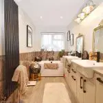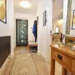 To the left of the hallway sits a large family bathroom, fully tiled and equipped with a feature bathtub, double washbasin, sizeable shower cubicle, and WC, along with a window overlooking the front aspect.