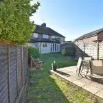The rear garden is mainly laid to lawn, with some mature shrubs and terraced areas.