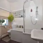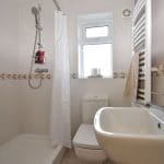 Cloakroom: Large shower tray, WC and wash basin with window to rear aspect. Tiled throughout.