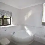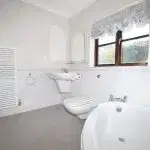Bathroom: Spacious bathroom with WC, wash basin, and large corner bathtub. Heated towel rail. Window to side aspect.
